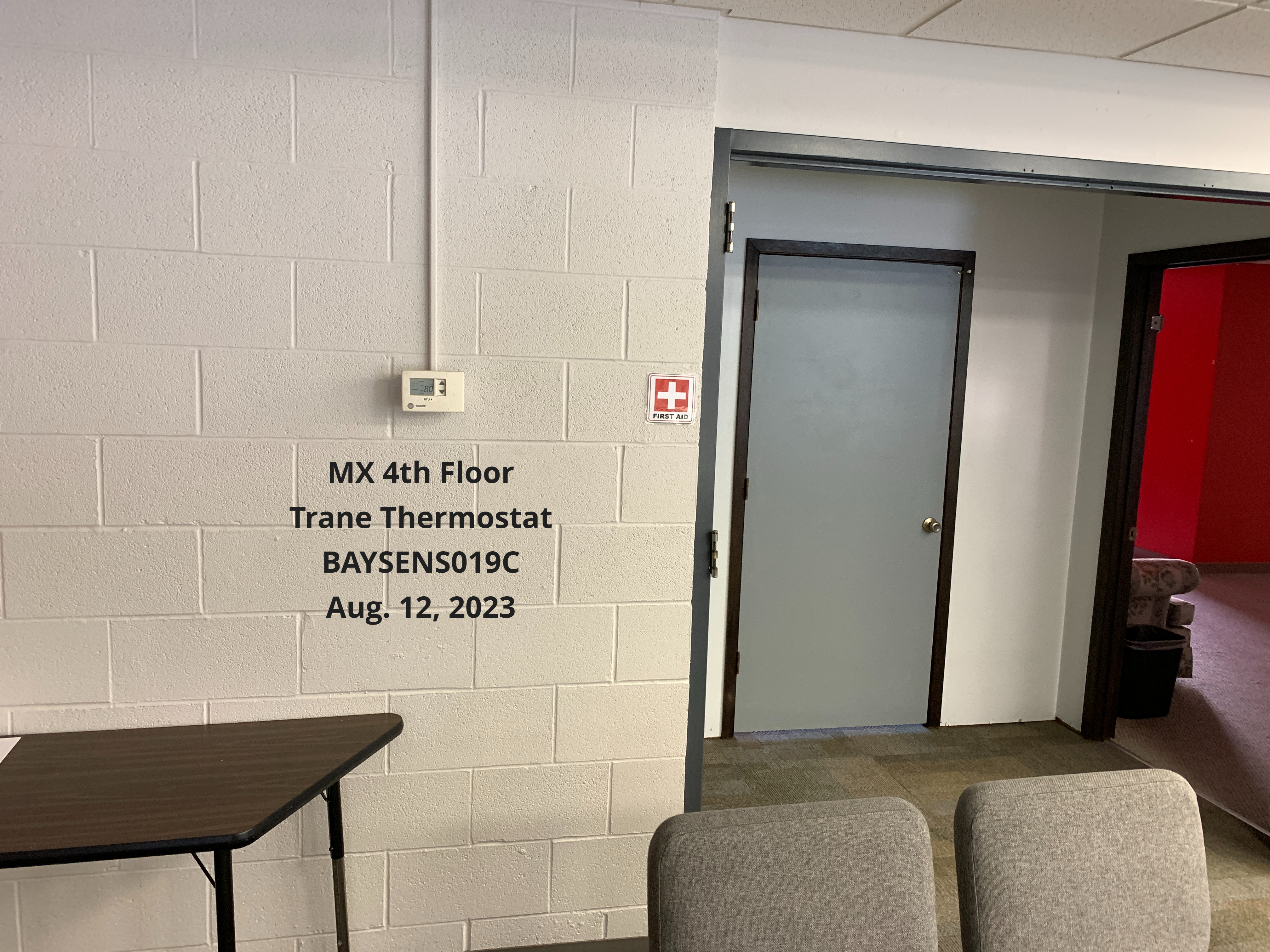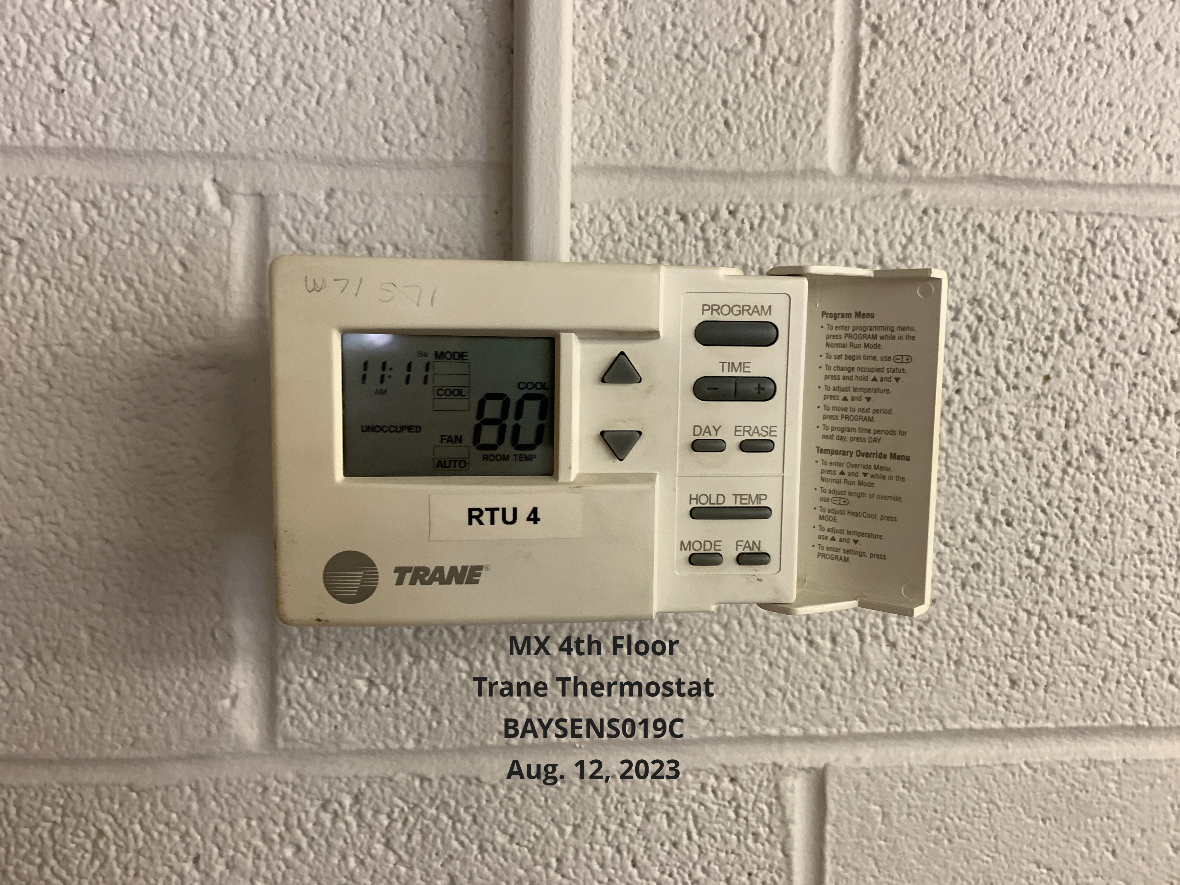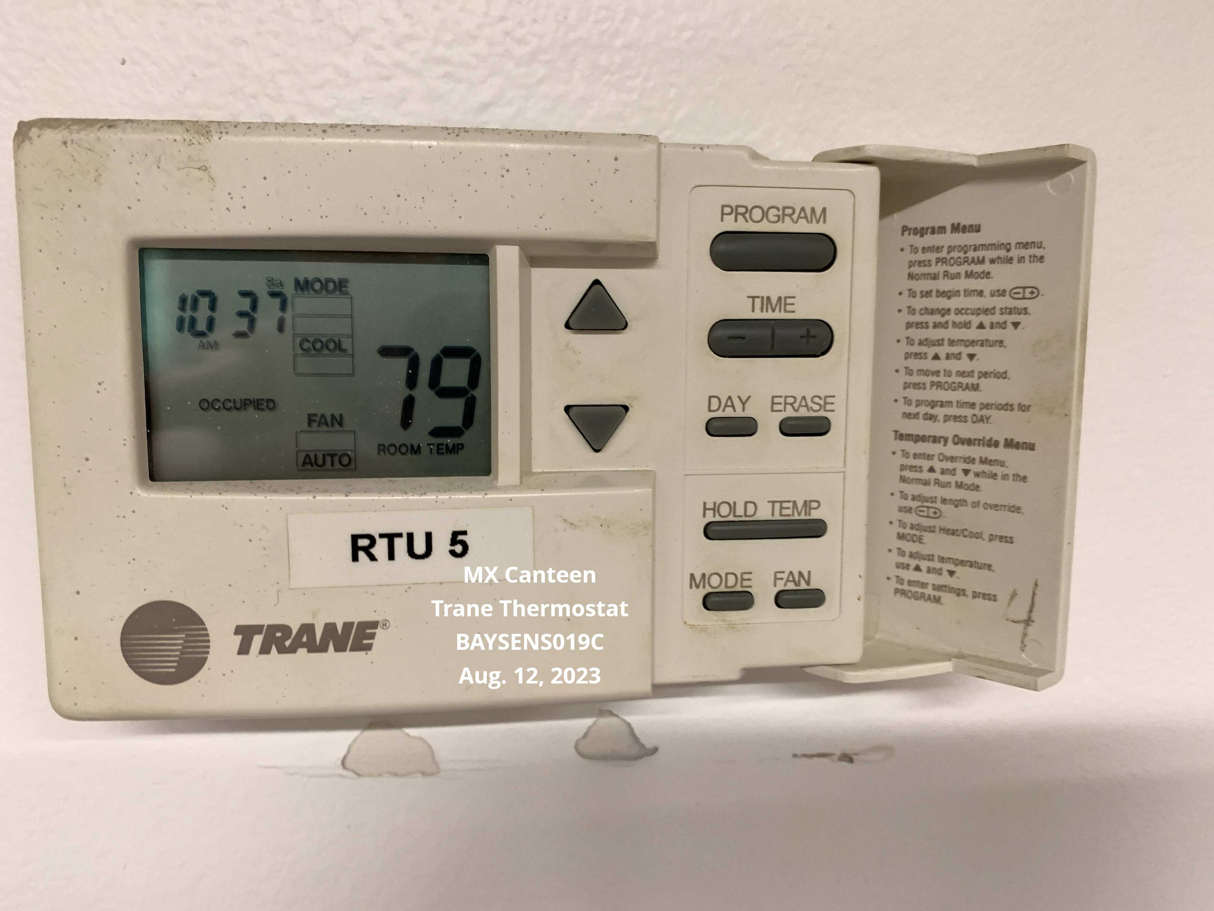 Note: the gym uses a Trane BAYSENS135A X13790886 Wired Display Sensor (RTU-6). All other thermostats noted are Trane Thermostat BAYSENS019C.