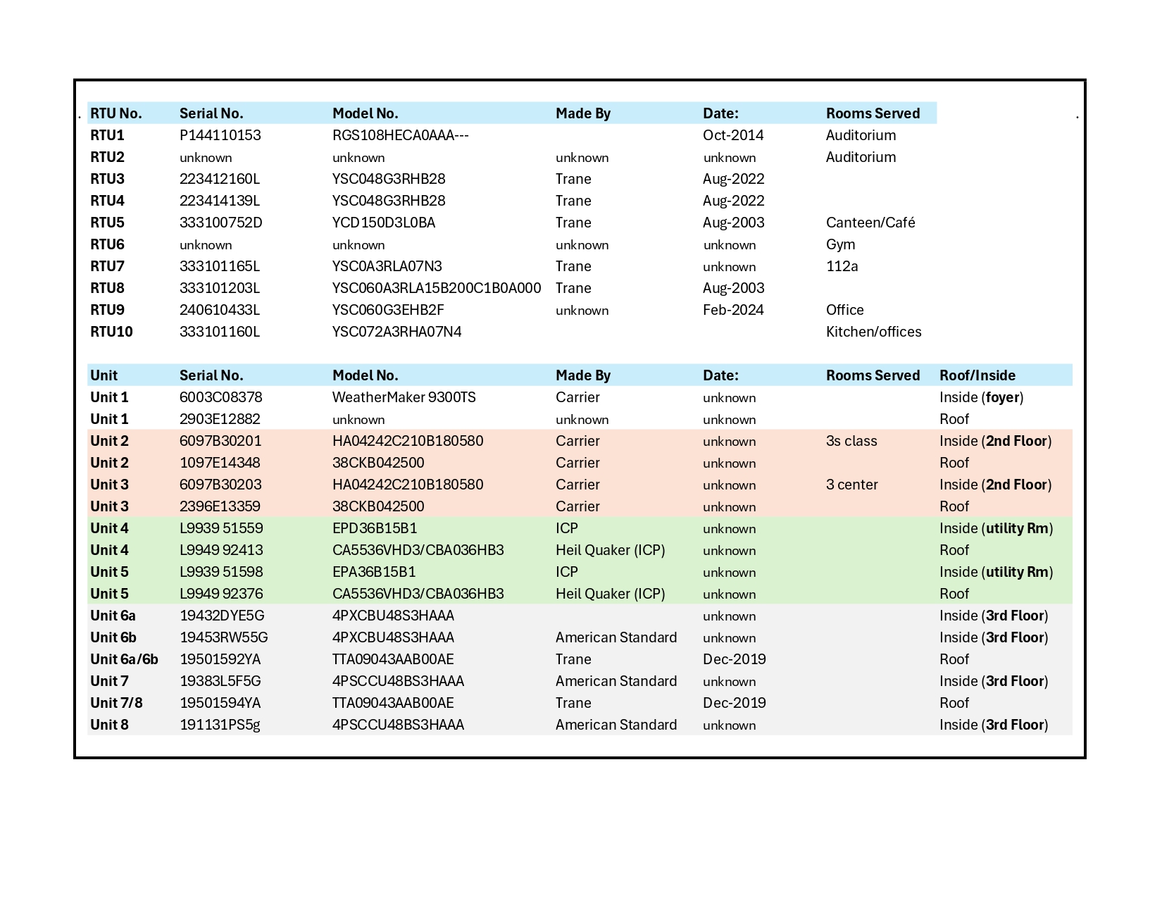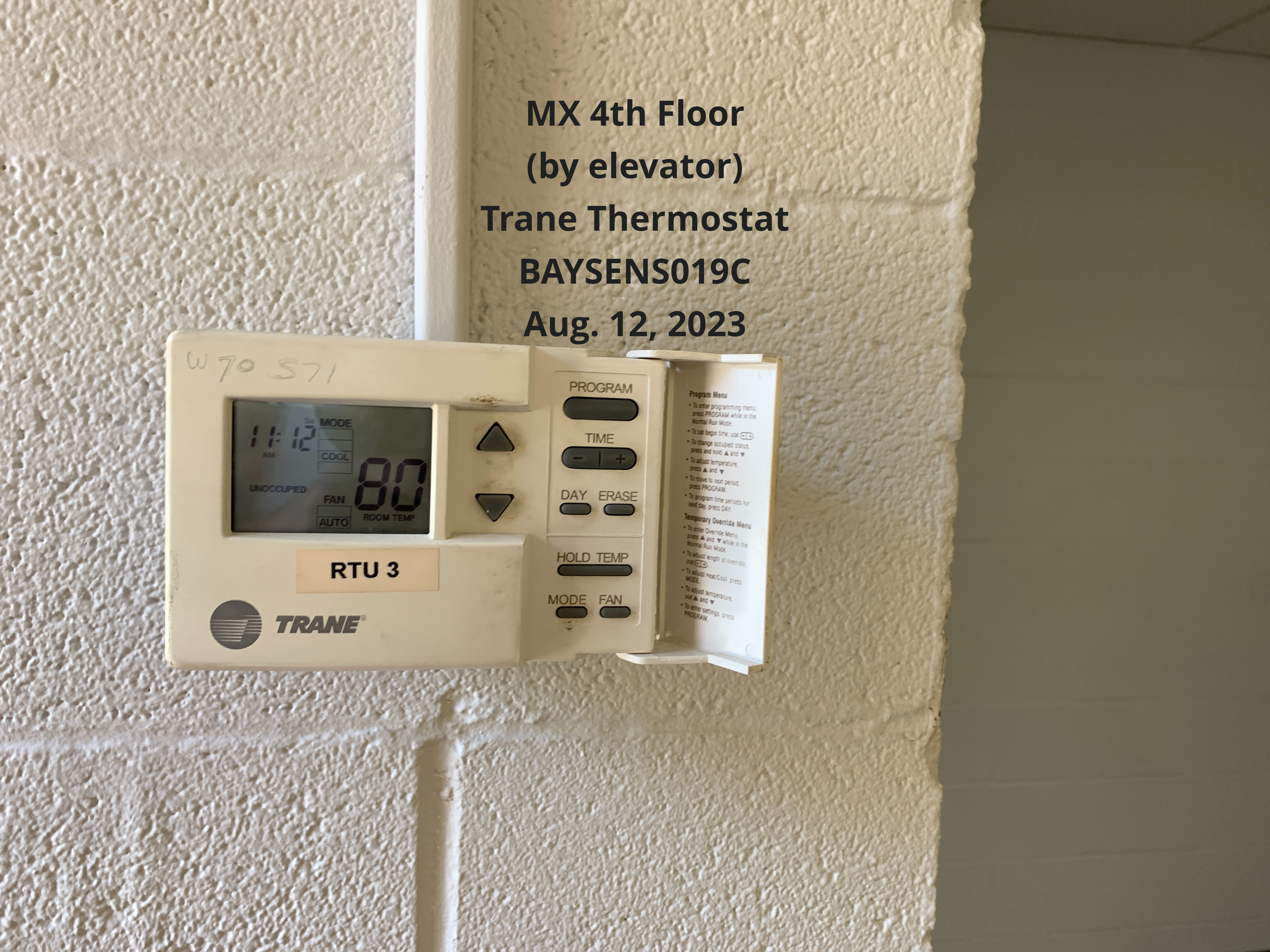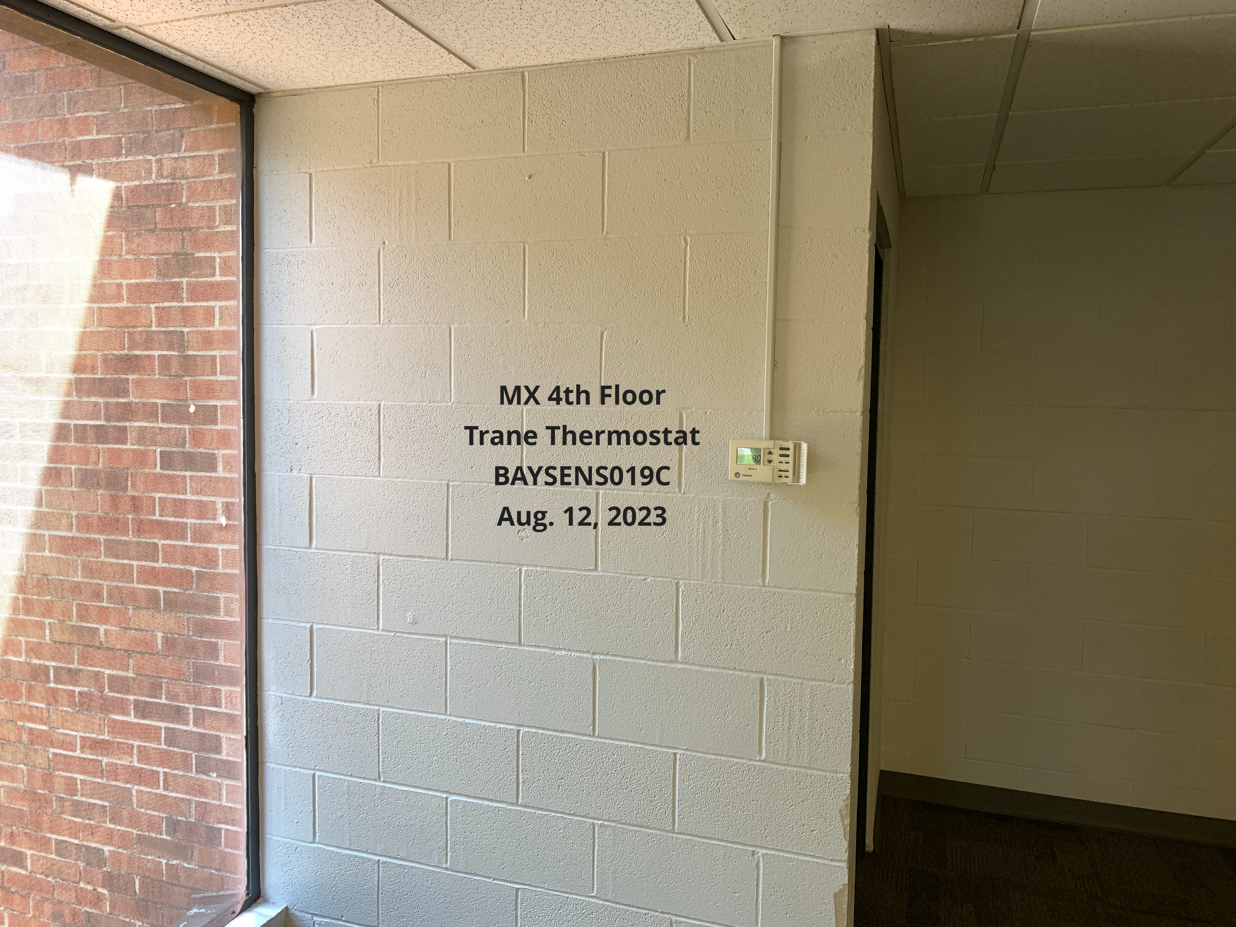 Note: the gym uses a Trane BAYSENS135A X13790886 Wired Display Sensor (RTU-6). All other thermostats noted are Trane Thermostat BAYSENS019C.
