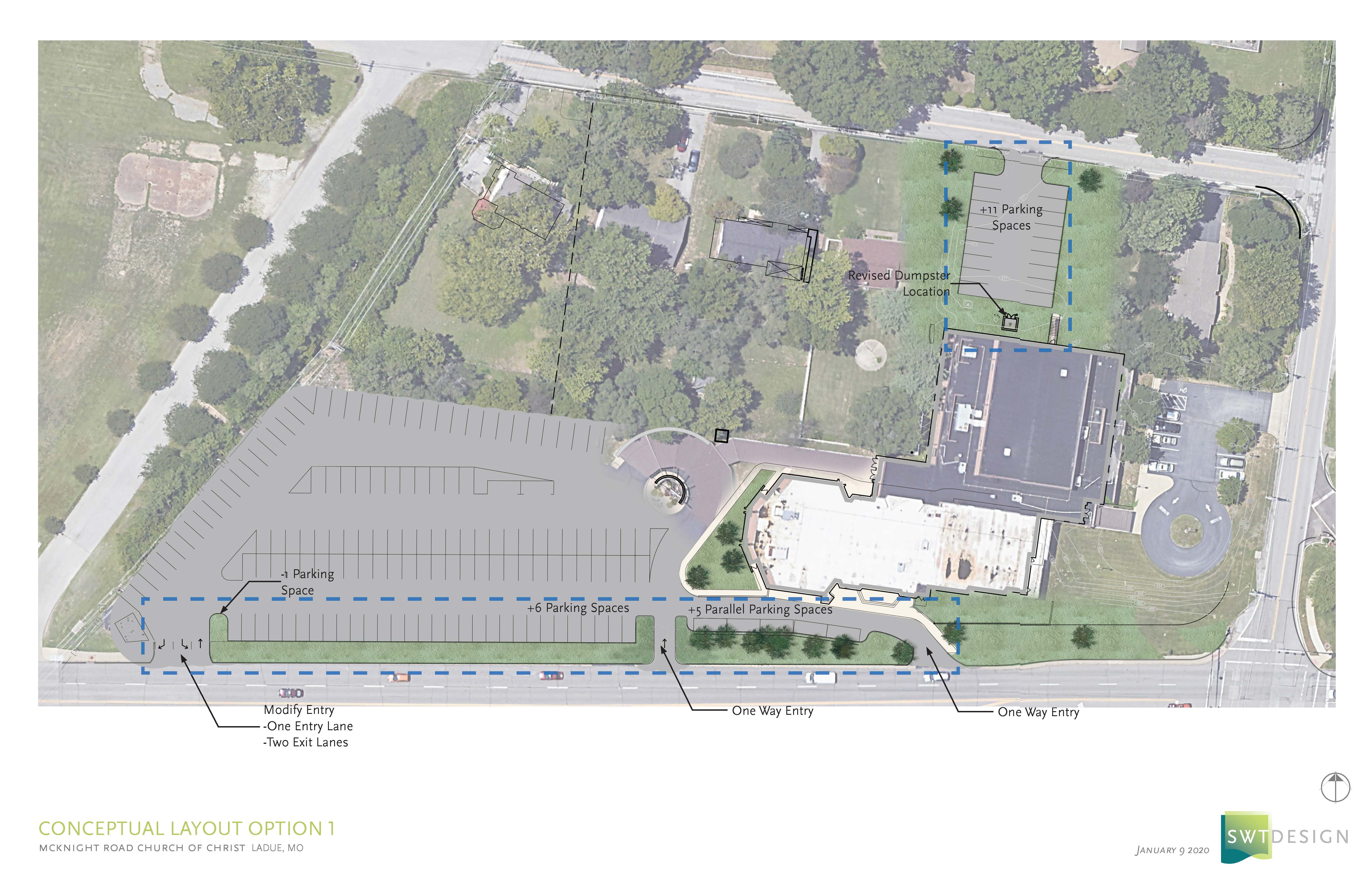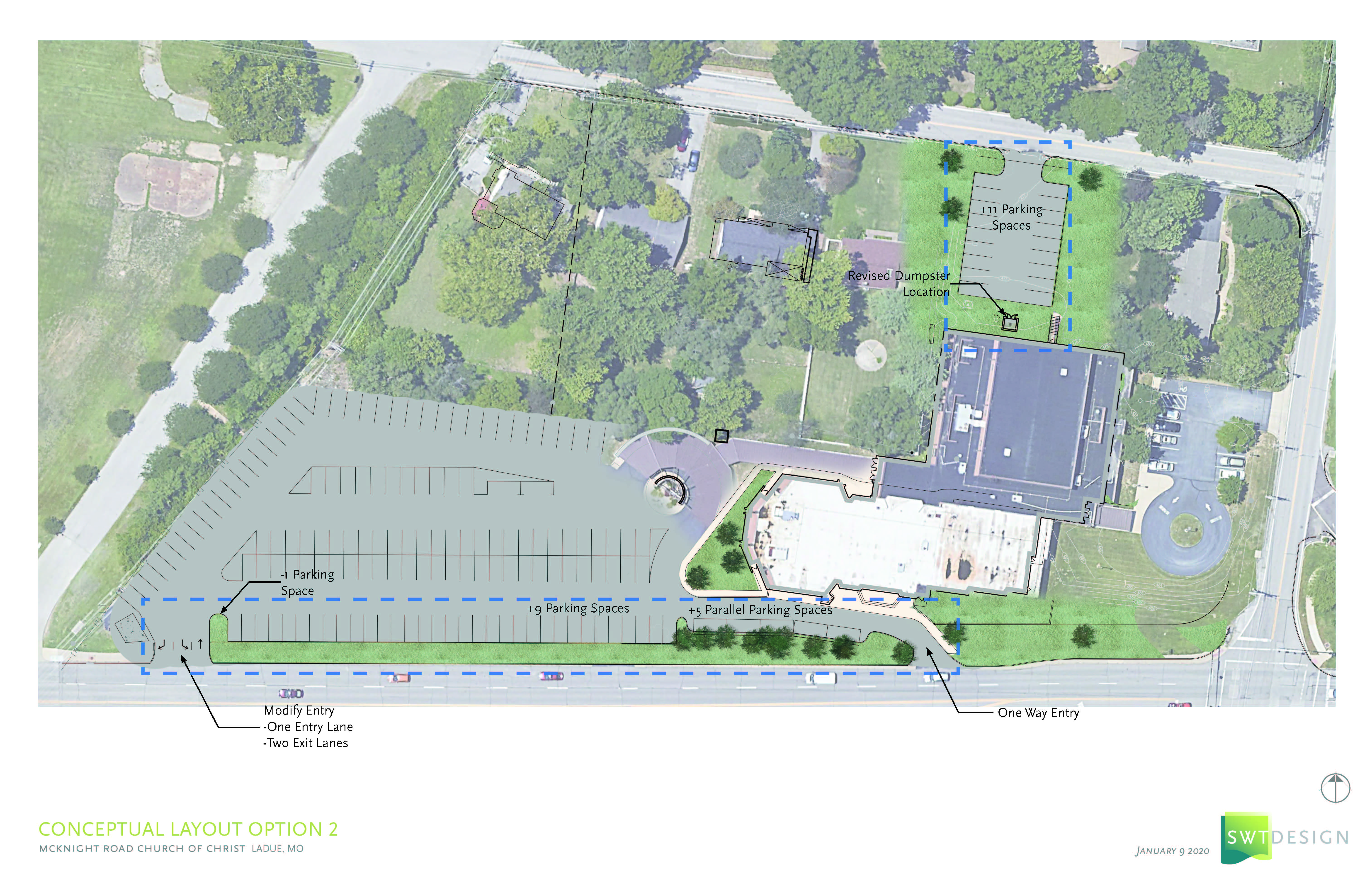 Below are preliminary examples of parking lot changes at the MX Church building - goal is to increase parking space. Click a drawing below to enlarge.